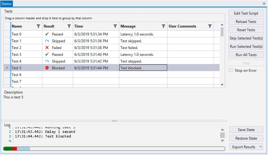 The DTM Test Manager allows you to define, organize, and execute groups of tests. Tests can be run sequentially or individually, and results can be grouped to easily find ones that have failed.