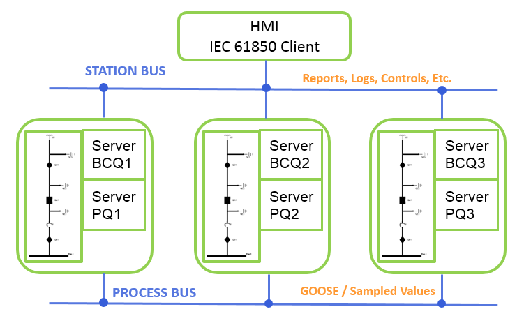 DTM is simulating the communications and Object Models of the Bay Controllers and protection IEDs. The simulation can be run on a single PC or distributed across multiple hosts to test the communication configuration of the substation with a real station bus and process bus. IED configurations are loaded from SCL files (.ICD or .SCD) including the Object Models, services, and communications. The HMI is a simulated IEC 61850 Client which subscribes to Control Blocks in the IEDs and issues controls to the IEDs.